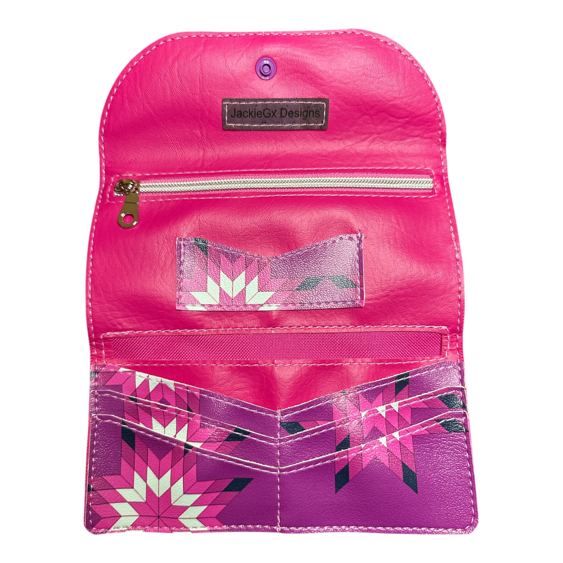 This wallet is so practical. There are six card slots, one slid pocket which would hold more cards or money. There's also a zippered compartment which would be great for money and/or coins. It measures 7 1/2 inches wide and 3 1/2 inches closed. When it's open, it's 10 inches long.