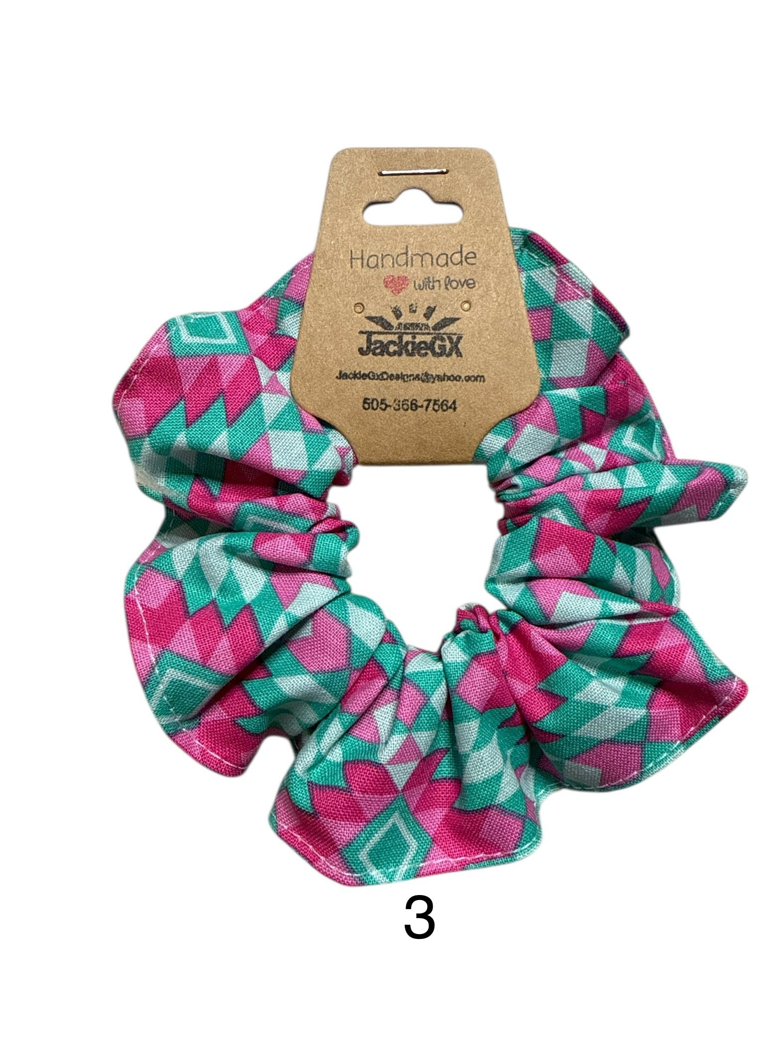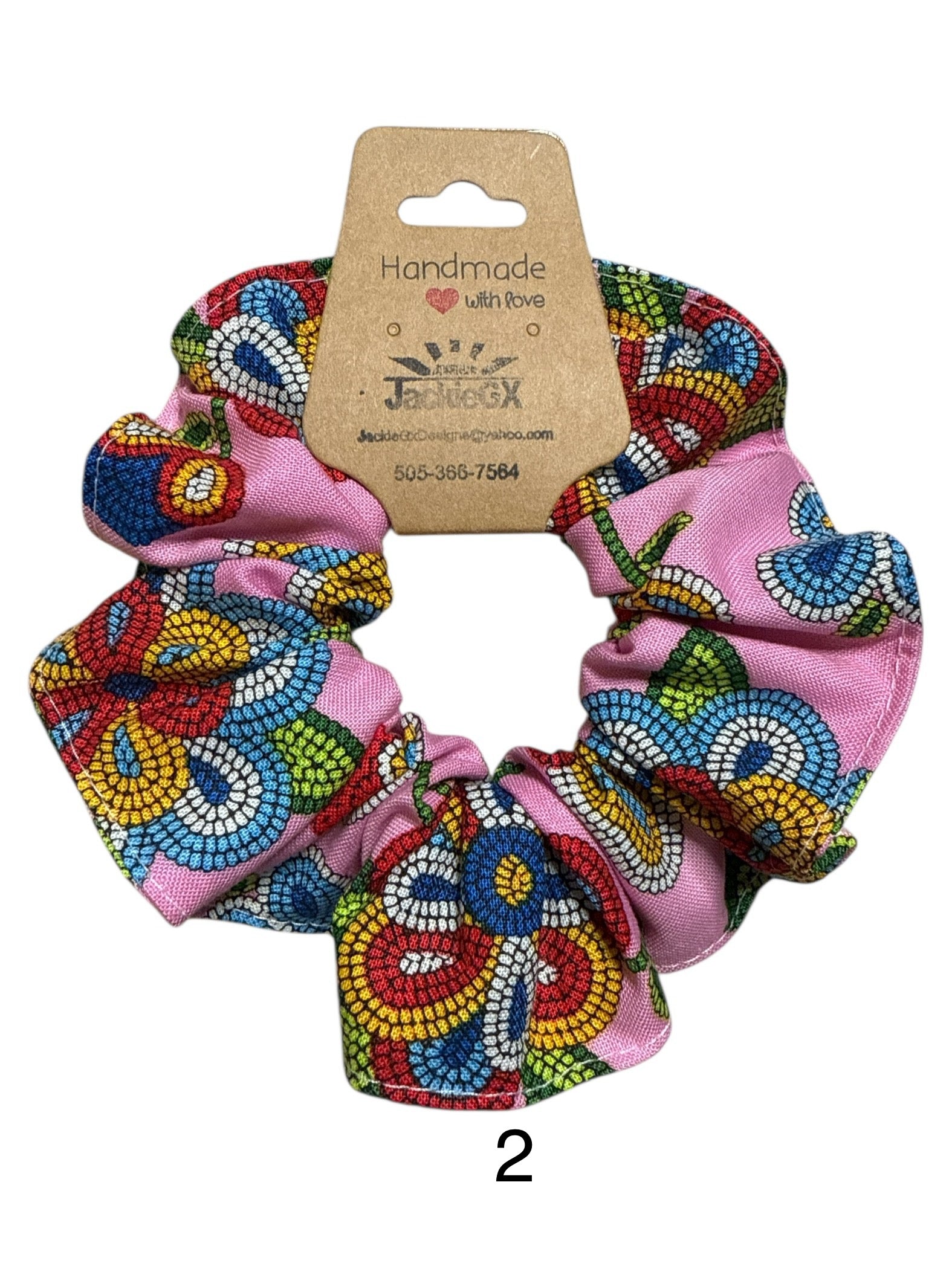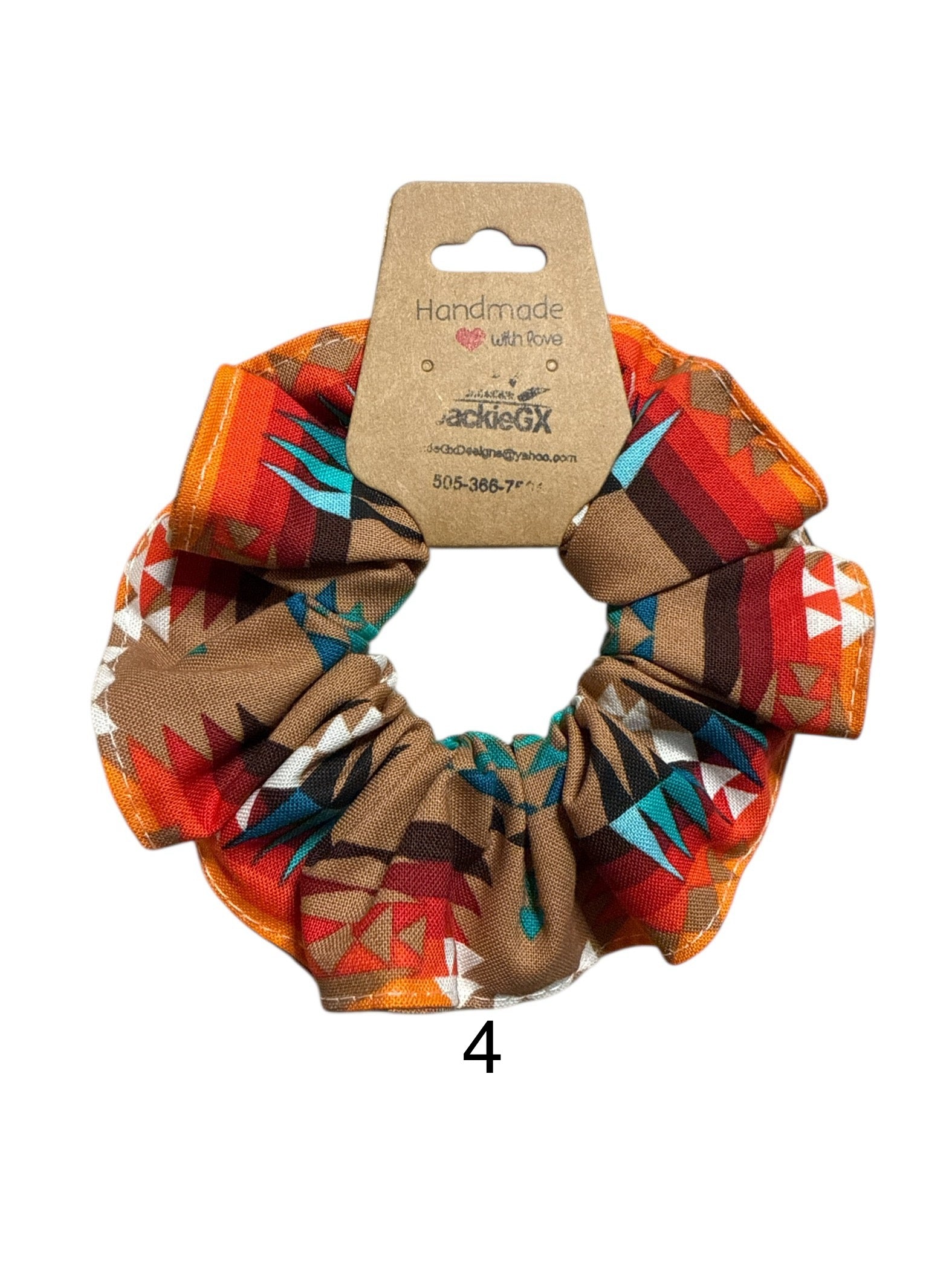 These scrunchies are made out of 100% cotton annd an hair tie. Some are in Native American print and kokum print.